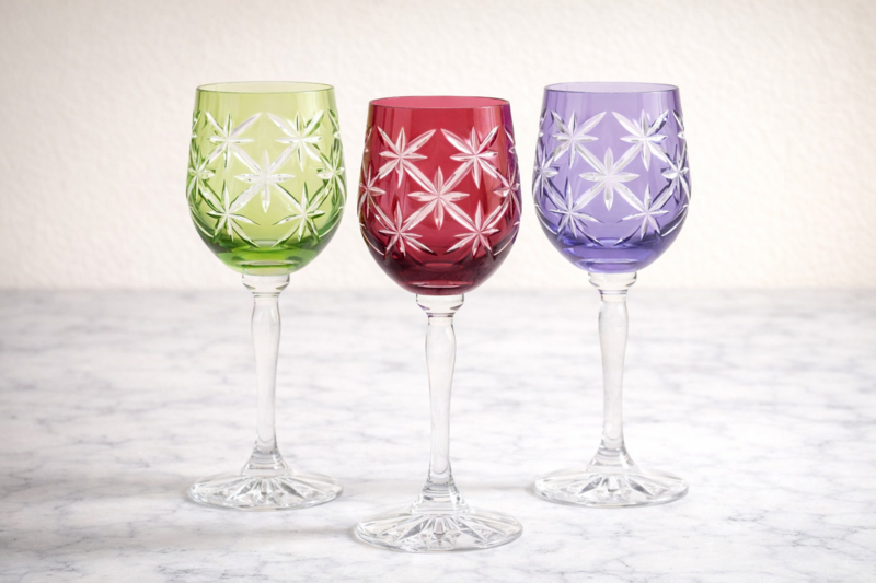 OverzichtEen handgeslepen kristallen wijnglas in vintage design.